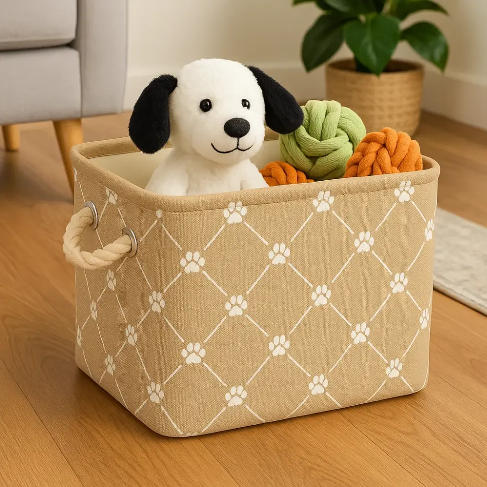 This small taupe paw print bin keeps your home clutter-free while providing a stylish, functional storage solution. Its lightweight and foldable design makes it easy to move, clean, or store, making it perfect for all pet owners.